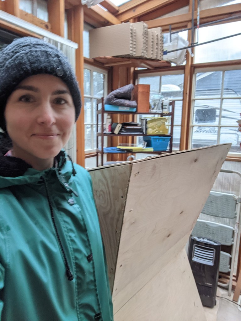blurry selfie next to a work in progress inside my freezing studio