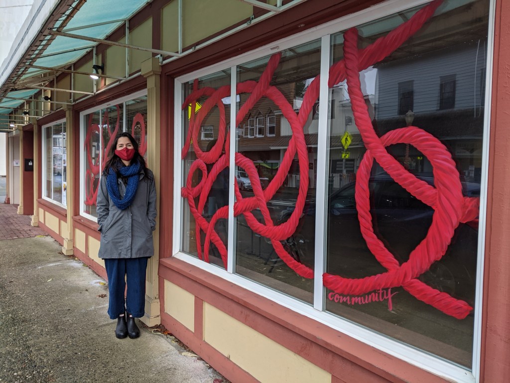 Artist Statement: This piece explores the connections that exist between all members of this community. In the midst of this trying time I have chosen to illustrate the concept of connection as a red thread. The winding and looping cord composed of delicate individual fibers represents the members of the community and the bonds that tie us to one another, a visual reminder that we exist in direct, if at times tenuous, inter-connectivity with others and that our fates are woven together. This version of a red thread expands upon centuries of imbued meaning across traditions and cultures. Here in Issaquah, it is my hope that this red thread challenges us to embrace the spaces where our diverse cultures intersect, honoring the individual strands that make the whole stronger and more resilient. I acknowledge that this temporary installation was completed on the traditional land of the Coast Salish and Duwamish People, past and present, and honor with gratitude the land itself and those Tribes.
